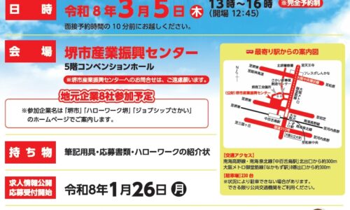 【堺市】55歳以上対象「シニア就職面接会」開催へ 8社が参加、3月5日