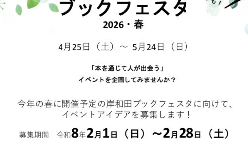 岸和田市立図書館は、4月25日から5月24日に開催予定の「岸和田ブックフェスタ2026・春」に向け、イベントアイデアの公募を行っている。テーマは「本を通じて人…