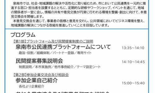 泉南市は、官民連携によるまちづくりを進めるため、「第1回 泉南市公民連携プラットフォーム意見交換会」を2月9日に開催する。市内外の事業者を対象に、公民連携の進…