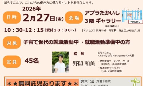 高石市はハローワーク泉大津と共催で、子育て世代の就職・再就職を支援する「マザーズ就活準備セミナー」を2月27日に開催する。テーマは「仕事も生活もスムーズに!暮…