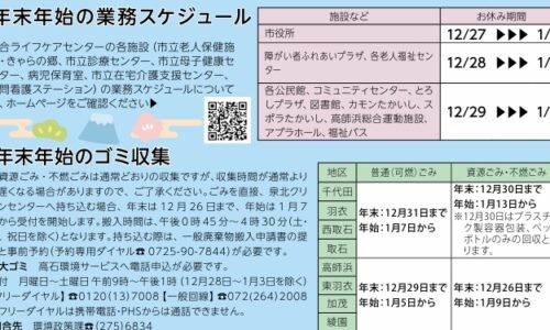 【高石市】年末年始のごみ回収と市役所関係の業務スケジュール!年末年始は、ごみ収集や市役所・公共施設の業務が通常と異なります。高石市が発表したスケジュー…