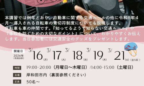 岸和田市は、交通事故防止を目的とした「令和8年 春の安全運転講習会」を、3月16日から21日にかけて市内5会場で開催する。自動車・自転車利用者を対象に、最新の…