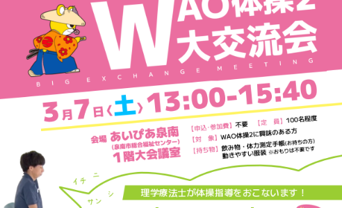 泉南市は、地域で健康づくりに取り組む人たちの交流を目的とした「WAO体操2大交流会」を、3月7日(土)に開催する。WAO体操2は、住み慣れた地域で元気…