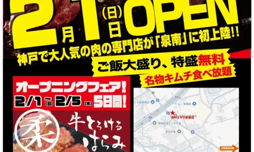 泉南市樽井の「ワンダーステーキ 泉南店」跡地に、肉料理専門店「肉のエサカ 泉南店」が2026年2月1日にグランドオープンする。運営は、食肉加工工場を手がける株…