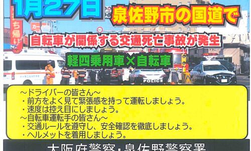 泉佐野警察署管内の国道26号線・市場北交差点で、1月27日(火)、軽四乗用車と自転車が出合頭に衝突する交通死亡事故が発生した。市内ではこれが令和8年最初の交通…