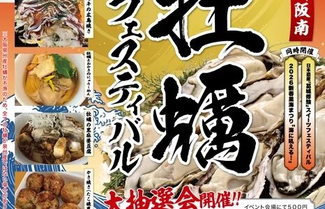 阪南市周辺で恒例となっている「第4回 泉州阪南 牡蠣フェスティバル」が、2026年1月10日(土)にせんなん里海公園(岬第2駐車場)で開催される。開催…