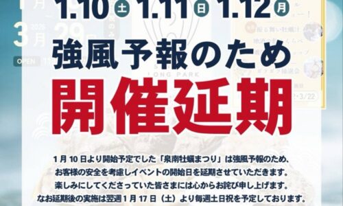 泉南市で開催予定だった冬の人気イベント**「泉南牡蠣まつり2026」**は、強風予報を受けて安全確保のため、開始日が1月10日から1月17日(土)に延期となっ…