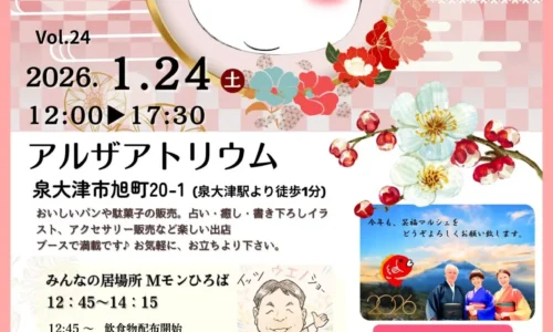 泉大津市旭町のアルザアトリウムで、2026年1月24日(土)に「笑福(えふ)マルシェ」が開催される。開催時間は12時~17時30分で、通常より開始時間が遅くな…