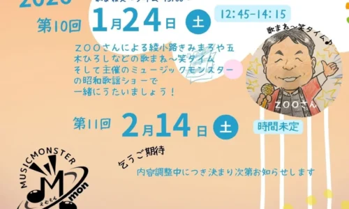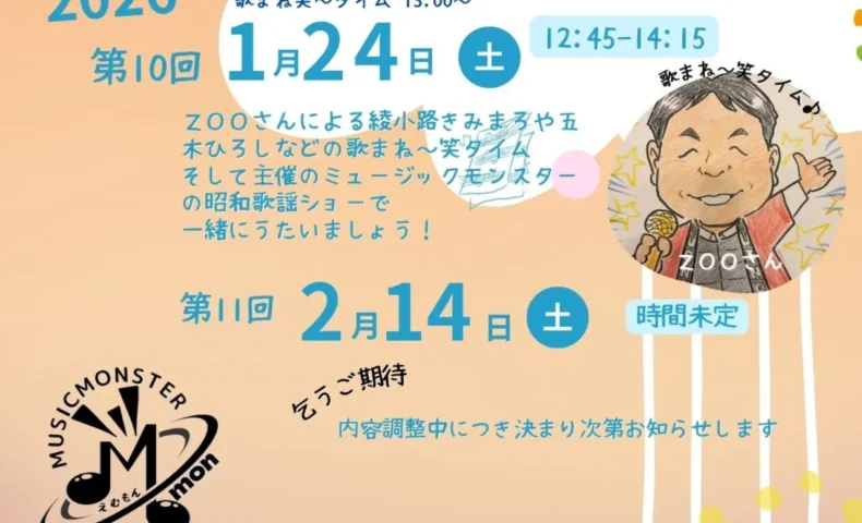 泉大津市のアルザアトリウムで、1月24日(土)に「~みんなの居場所~ Mモンひろば」が開催される。時間は12時45分から14時15分までで、申込不要・参加無料の交流イベントとなっている。当日は13時ごろから、デイサービスや高齢者向けイベントで活躍するZOOさんによる歌まね・物まねを交えた「笑タイム」を実施。綾小路きみまろさんや昭和タレントの歌まねなど、世代を問わず楽し…