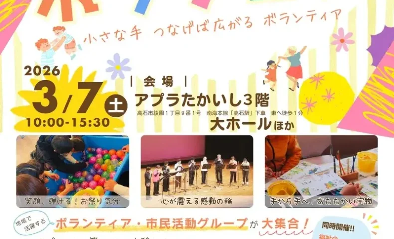 2026年3月7日(土)10時から15時45分まで、アプラたかいし(高石市綾園1-9-1)で「第19回たかいしボランティア・市民活動フェスティバル(通称:ボラ…