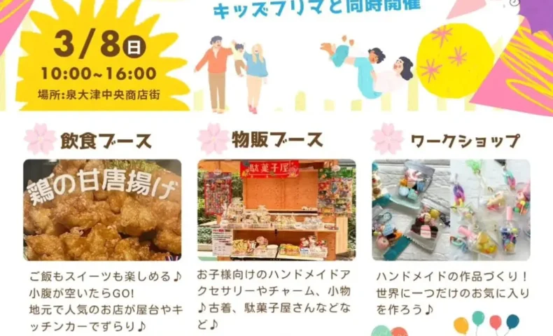 2026年3月8日(日)10時~16時、泉大津中央商店街(泉大津市若宮町6-5)で「おやこdeたのしむ ハピラキまつり」が開催されます。地元で人気のお店がキッ…