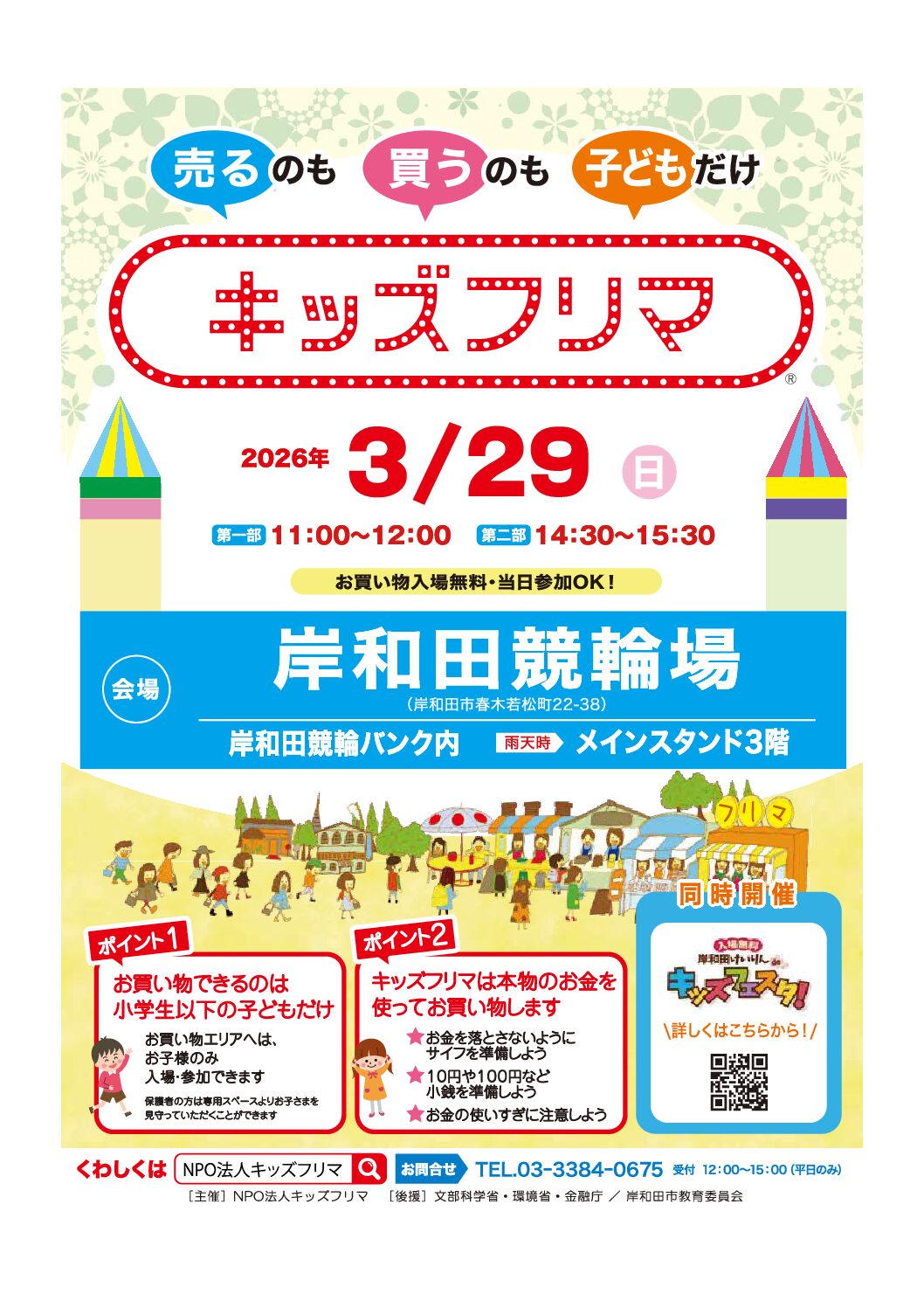 子どもだけで売り買いを行う人気イベント「キッズフリマ」が、3月29日(日)に岸和田競輪場で初開催される。会場は岸和田競輪バンク内で、入場は無料。お金の大切さや…