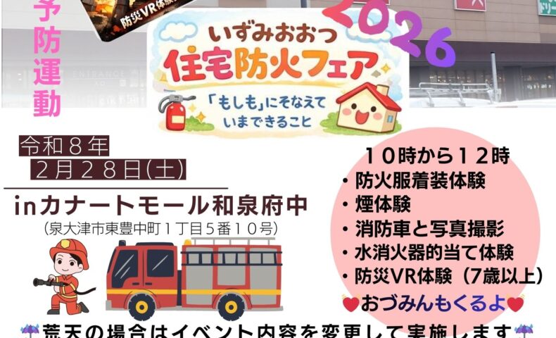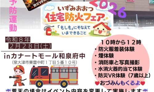 泉大津市で2月28日午前、体験型の「いずみおおつ住宅防火フェア2026」が開催される。会場はカナートモール和泉府中。春の火災予防運動を前に、防火・防災意識の向…