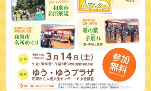 和泉の名所や伝承文化を多世代で楽しむ公演「多世代でつなぐ郷土の文化~和泉の名所、葛の葉物語、盆踊り~」が、2026年3月14日(土)、和泉市立人権文化センター…