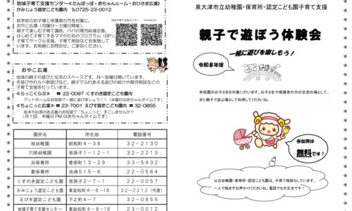 泉大津市は、未就園児の親子を対象とした「親子で遊ぼう体験会」を開催します。幼稚園や保育所、認定こども園で実施され、親子で遊びながら交流できるイベントです。…