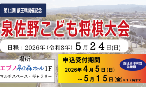 泉佐野市にて「第11期将棋叡王戦五番勝負」第4局が開催されることを記念し、2026年5月24日(日)、エブノ泉の森ホールにおいて「泉佐野こども将棋大会」が開催…