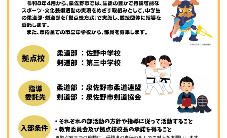 【泉佐野市】令和8年4月から部活動に「拠点校方式」を導入 柔道・剣道で全市立中から部員募集