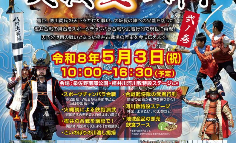 2026年5月3日(日・祝)、泉佐野市にて「大坂夏の陣」の前哨戦となった「樫井(かしい)の合戦」を現代に再現するイベントが開催されます。本イベントは「樫井川かわまちづくり推進協議会」が主催し、合戦の跡地に近い泉佐野南部公園グラウンドと樫井川河川敷を舞台に、歴史を身近に体感できる様々なプログラムが実施されます。主な実施内容は以下の通りです。紀州雑賀鉄砲…