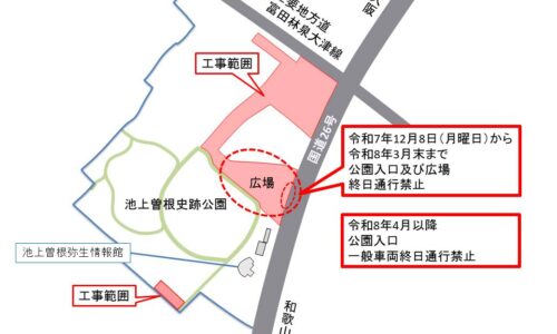 和泉市は、史跡池上曽根遺跡で進められる第2期整備工事に伴い、国道出入り口および広場を閉鎖すると発表した。閉鎖期間は、令和7年12月8日(月)から令和8…